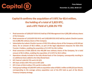 最新消息:歐洲首家比特幣財庫公司 Capital B (@_ALCPB) 增加了 5 BTC,使其總持有量達到 2,823 $BTC。